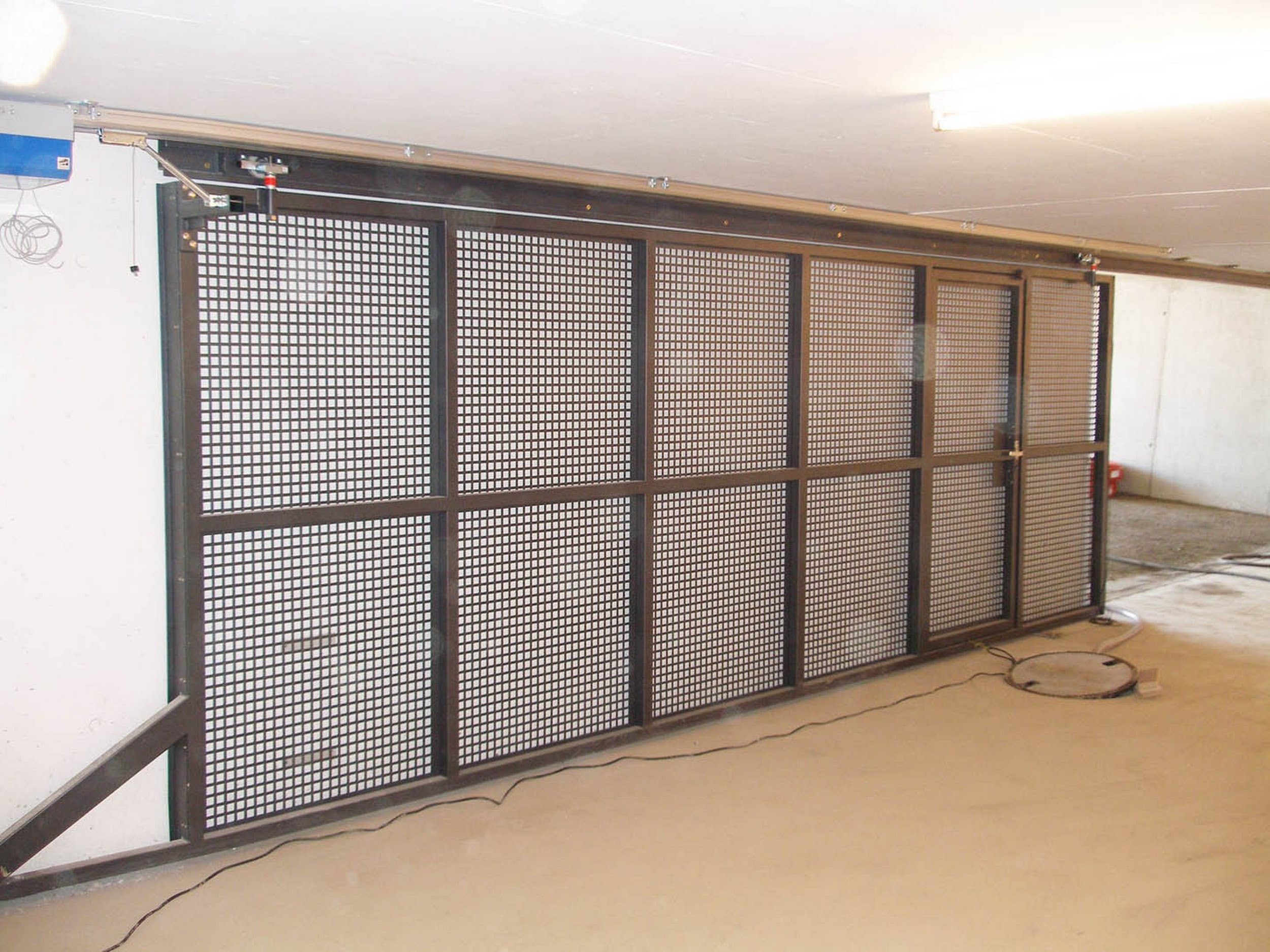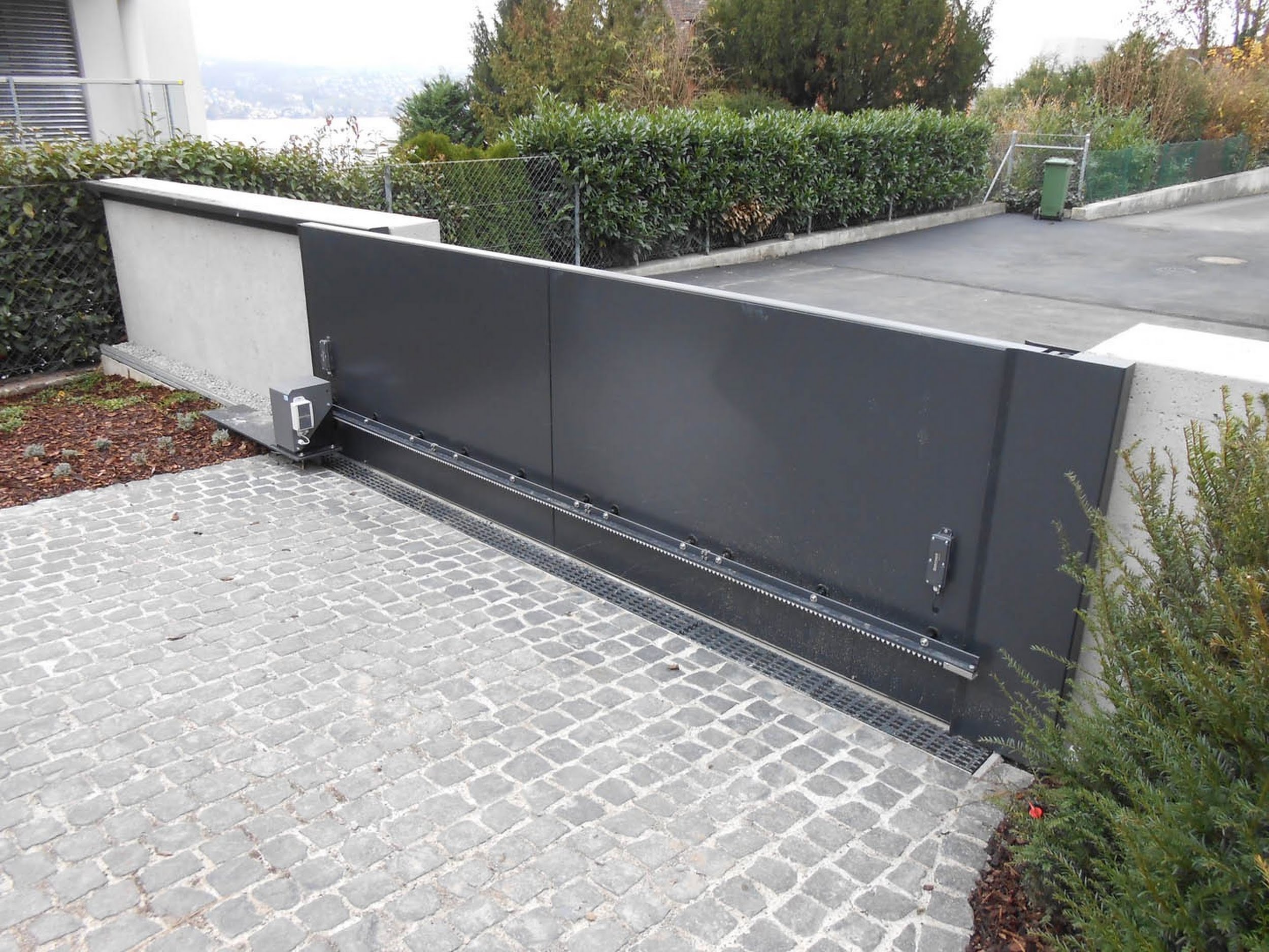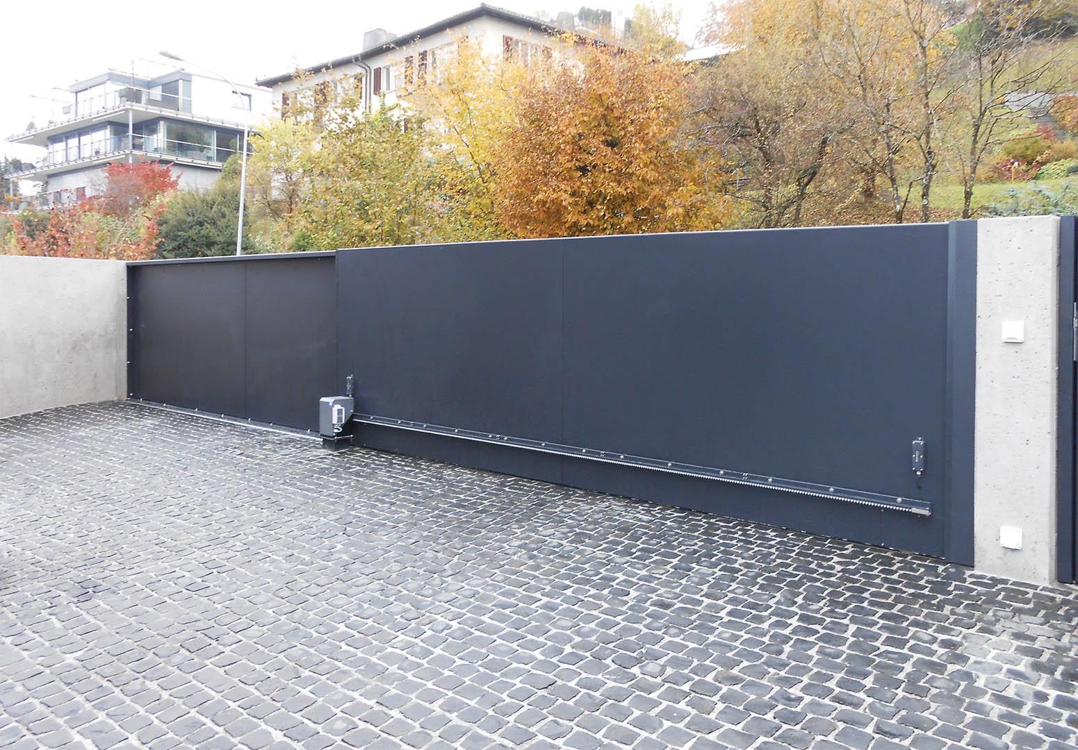Für stark frequentierte Tore in Tiefgaragen oder für Produktionsstrassen in der Industrie werden meistens unten laufende Schiebetore verwendet. Durch die kugelgelagerten, gross dimensionierten Laufrollen können die Tore sehr leichtgängig bewegt werden. Arealabschlusstore werden als freitragende Schiebetore ausgeführt. Das heisst, keine störende Bodenschiene welche im Winter anfriert oder dem Schnee-Räumungsdienst den Weg versperrt. Aussergewöhnliches spornt uns immer wieder an, wie etwa die Herstellung von Hangartoren für Flughäfen oder für das Militär. Die Tore können mit Schienen an der Decke, am Sturz befestigt oder als untenlaufende Variante, am Boden montiert werden. Spezial-Laufwerke mit Laufrollen aus hochwertigem Kunststoff oder Edelstahl sorgen für eine sanfte Bewegung.