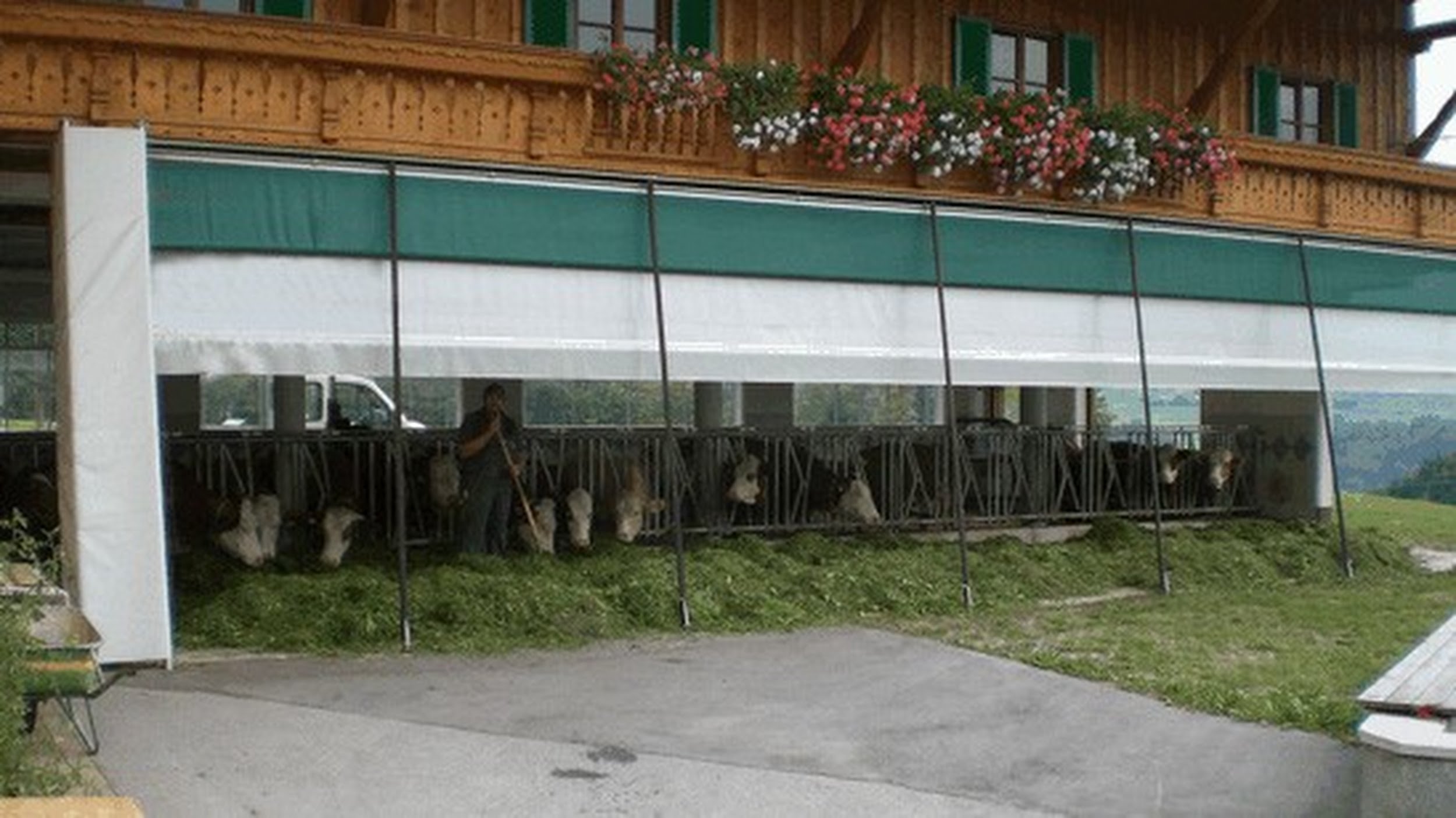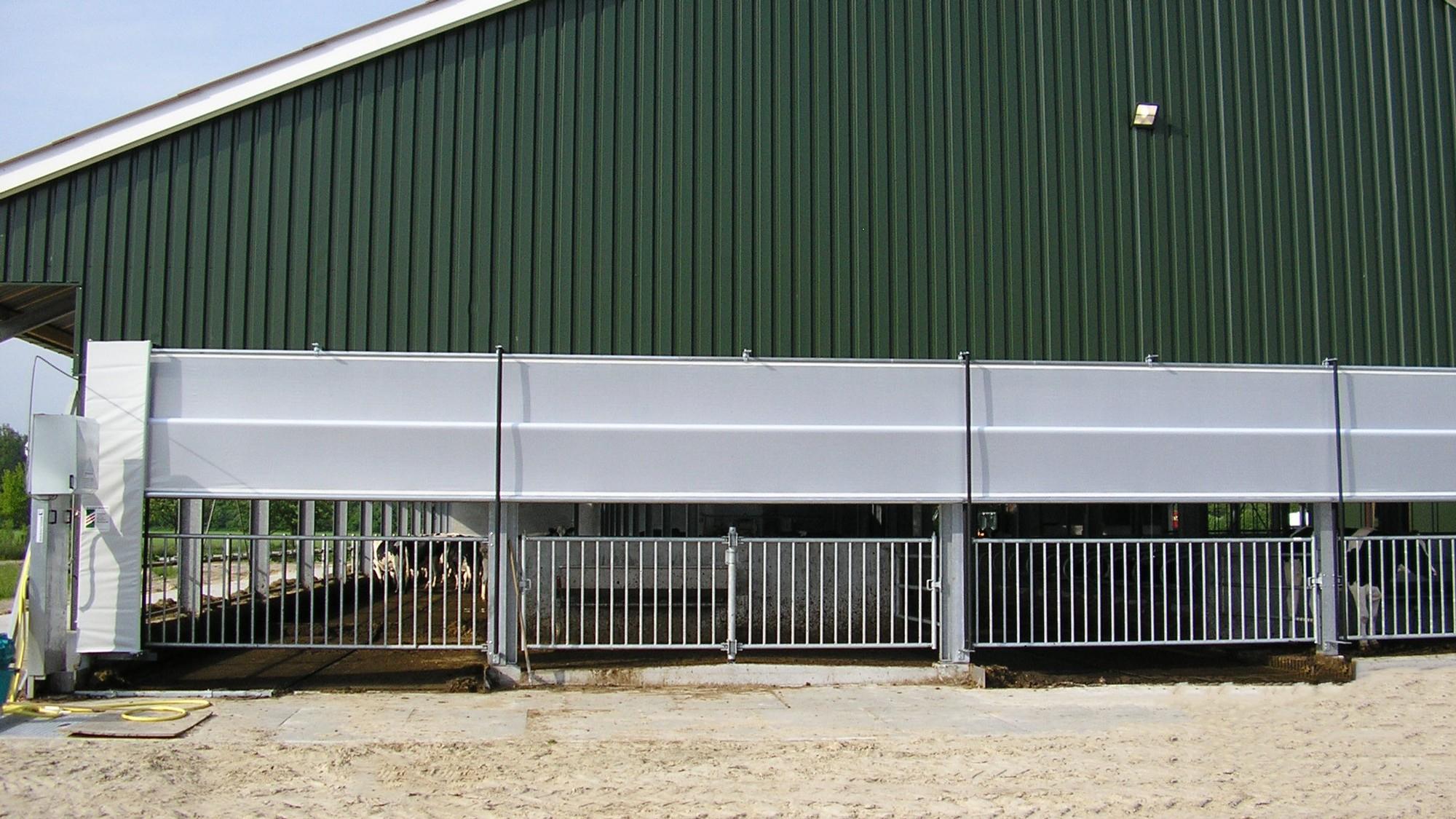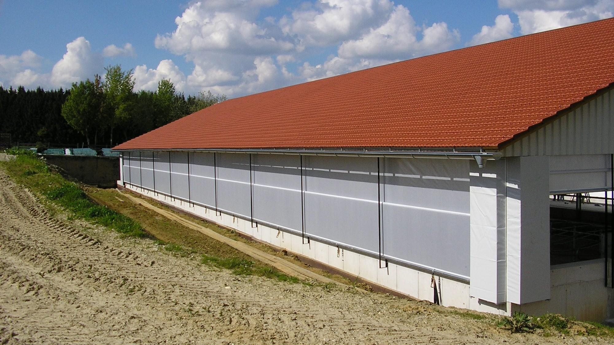 Der untere Antrieb ist frei hängend montiert - die Plane wird durch ihr Eigengewicht immer auf Spannung gehalten, womit ein automatischer Ausgleich unterschiedlicher Wickelgeschwindigkeiten ermöglicht sowie von durch Witterungseinflüsse verursachte Gewebeunebenheiten und -dehnungen vermieden werden.